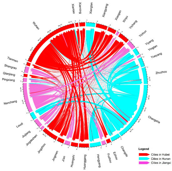 Chord graph of consumption flows of cities in the middle reaches of the Yangtze River.