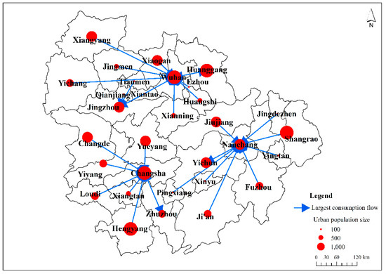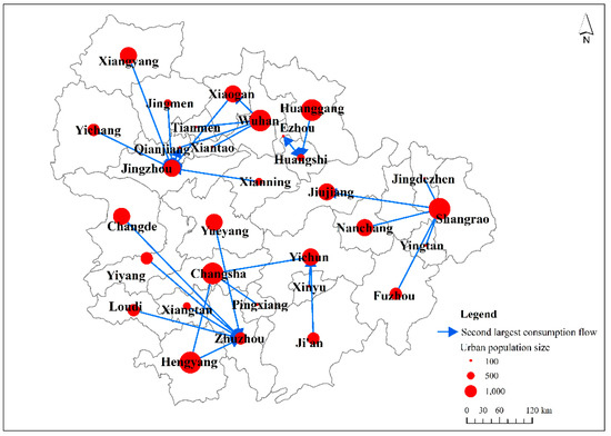 Furthermore, according to the dominant flow theory, by analyzing the largest and second largest consumption flows of the cities in the middle reaches of the Yangtze River, combined with the size of the urban resident population, cities can be divided into three levels, and the spatial flow direction of the largest and second largest consumption flows can be visualized (Figure 6 and Figure 7). First, the largest consumption flows of cities in the middle reaches of the Yangtze River have formed three relatively independent sub-structures in space. The largest consumption flows of cities are essentially absorbed by the provincial capital cities of their respective provinces. For instance, Wuhan accepted the largest consumption flows from nine cities including Ezhou, Huanggang, Huangshi, Jingmen, and Jingzhou, which have smaller populations than Wuhan; Changsha accepted the largest consumption flows from seven cities, including Changde, Hengyang, Zhuzhou, Loudi, and Xiangtan. Nanchang accepted the largest consumption flows from nine cities, such as Fuzhou, Ji’an, Jingdezhen, Jiujiang, and Pingxiang, and so on. It can be seen that the largest consumption flows absorbed by Wuhan, Changsha, and Nanchang do not exceed 90% of the total number of cities, which is not in line with the standards of dominant cities. The three cities only lead a dominant role in some areas, thus they are called the local dominant city and classified as cities in the highest level of the consumption network of the urban agglomeration. It is worth noting that Jingzhou has obtained the largest consumption flows of Tianmen, Xiantao, and Qianjiang, indicating that Jingzhou is a higher-level city in the consumption network except for the three provincial capital cities.