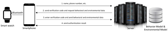 We propose an implicit secondary authentication scheme to prevent device theft in SMS authentication. The proposed scheme can be divided into data acquisition, data preprocessing, and user registration and authentication. Figure 1 shows the architecture of the authentication scheme proposed in this paper. In step 1, a user enters personal information such as name and phone number to use SMS authentication when identification is required. In step 2, an authentication server sends an SMS verification code to the user’s phone number and requests user’s behavioral and environmental data. In step 3, the user enters the SMS verification code, and the user’s smartphone sends behavioral and environmental data to the authentication server. The authentication server generates a user behavioral model for every location of the smartphone after preprocessing the previously collected behavioral data. The smartphone may be located on a table, in the user’s hand, or the user’s pocket. The authentication server generates a user environmental model by using the extracted feature vector. The authentication server verifies the SMS authentication code sent by the user and determines the location of the smartphone by inputting the first vector of the received behavioral data into the location decision classifier to determine the location of the smartphone. The received user behavioral data are compared with the user behavioral model of the determined location saved in the authentication server. The extracted feature of the user’s surrounding environmental data is input into the user environmental model. The confidence value output by the user environmental model is combined with the difference between the received user behavioral data and behavioral model. The combined score is compared with a predefined threshold. If the combined score is less than or equal to the threshold, authentication is successful; otherwise, authentication fails. In step 4, the authentication server sends the authentication result to the user. The proposed scheme is not different from the normal SMS authentication process. In addition, it does not make any additional requests to the user.