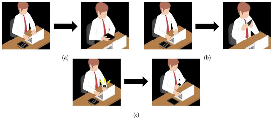 Figure 2 shows the behavioral pattern when a user checks an SMS verification code on his/her smartphone, which is on a table. Users naturally pick up the smartphone for checking the code when the code the received. Figure 2a,b show that the speed with which and height at which users lift a smartphone are different. As shown in Figure 2c, a user with a smart watch checks the SMS verification code on the smart watch because the smart watch also receives the code. Table 1 provides a list of sensors used for user behavioral data acquisition. We collect accelerometer and gyroscope data from a smart device such as a smartphone and smart watch. The smartphone and smart watch have a built-in accelerometer and gyroscope. The smart watch is connected to the smartphone and behavioral data collected from the smart watch are sent to the smartphone through Bluetooth.