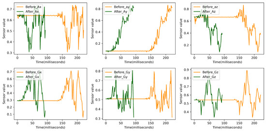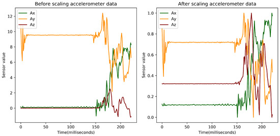 where represents the x-axis of each sensor, represents the y-axis of each sensor, and represents the z-axis of each sensor. Figure 3 shows accelerometer data before and after scaling.