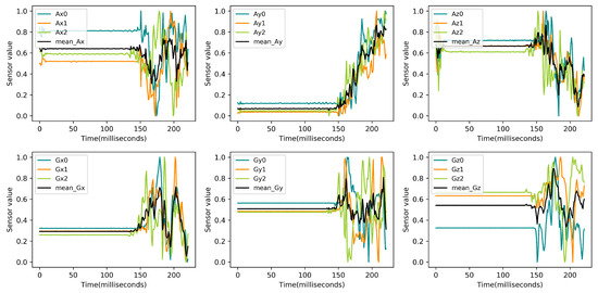 Figure 5 shows scaled sensor data after calculating the average of three behavioral data points over the entire time period. The average of the sensor data obtained three times over the entire time period is calculated and then data scaling and the behavioral starting point calculation are performed as described in Section 3.2.1. As shown in Figure 4, sensor data, obtained after detecting the behavioral starting point, is registered as a behavioral model in the authentication server.