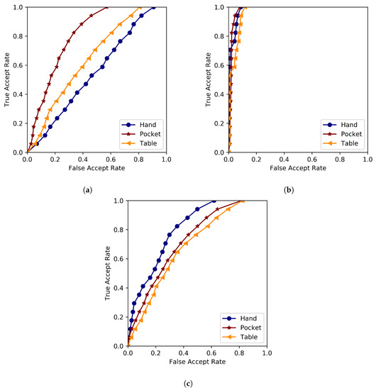 Experimental results showed an EER of 38.984% when the smartphone was on a table, EER of 46.66% when in the user’s hand, and EER of 25.33% when in the user’s pocket. The average EER for all locations of the smartphone was 36.99%. When the smartphone was in the user’s pocket, the EER was measured to be the lowest. Figure 6a shows the ROC curve for comparing performance based on the location of the smartphone in the experiments. The AUROC values were measured as 0.6503, 0.5542, and 0.8057 when the smartphone is on a table, in the user’s hand, and in the user’s pocket, respectively. The AUROC value was also measured to be the highest when the smartphone was in the user’s pocket.