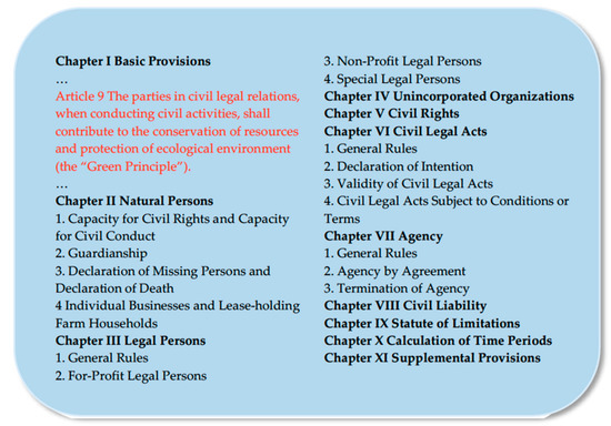 - Lv, Z.M. Research Group. The Implementation Outline of the “Green Principle” in Civil Code. China Law Sci. 2018, 1, 7–8. (In Chinese) [Google Scholar]