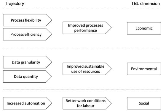 In the literature discussing the sustainability of I40, we observed three individual trajectories of sustainability of I40 applications (see Figure 2). The impact over the economic dimension of the TBL is the result of improved process flexibility and efficiency, which in turns improves the economic performance. The trajectory over the environmental dimension of the TBL instead leverages on the improved quantity and granularity of data produced by the digital technology which improves the sustainable use of resources. Finally, the trajectory over the societal dimension of the TBL leverages increased automation thanks to the use of robotics and digitally connected pieces of machinery which create better labor conditions.