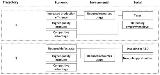 On the economic side, in our case, we found that I40 leads to increased production efficiency, higher quality products, and competitive advantage. This combination of economic factors is present in two trajectories.