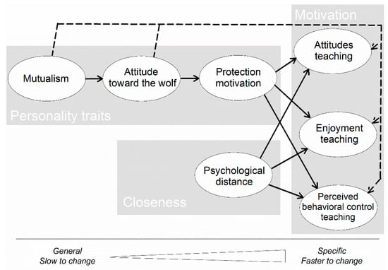 As an additional test of this structure, we calculated an additional structural equation model with direct effects of the deeper variables on the motivational factors and compared it to our theoretical model. In this additional model, only the most specific contextual factors of psychological distance and protection motivation were predictive of the attitudes, enjoyment and perceived behavioural control towards teaching. This additionally indicated the direct effects of these variables and indirect effects of mutualism and attitudes towards the wolf according to the selected theoretical model.