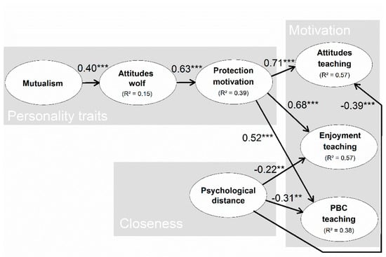 As described in Table 1, most of the variables showed a slightly negatively skewed distribution. This concerned almost all variables except for mutualism and attitudes towards the wolf. The skewness was mainly due to relatively high values for the motivational variables of attitudes (M = 4.38; SD = 0.90; Mdn = 4.33), enjoyment (M = 3.91; SD = 0.94; Mdn = 4.00) and perceived behavioural control (M = 3.86; SD = 0.98; Mdn = 4.00) towards teaching. The skew also concerned protection motivation (M = 3.66; SD = 1.04; Mdn = 3.66). The highest value was reported for psychological distance (M = 4.79; SD = 1.14; Mdn = 5.00).