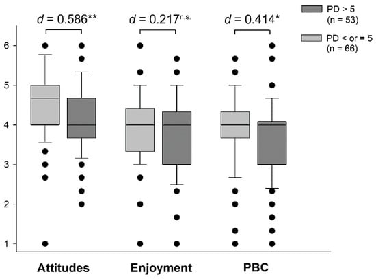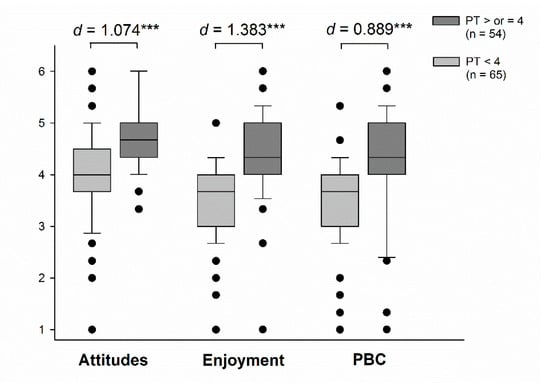 To further illustrate the differences for pre-service teachers’ motivational factors based on their psychological distance and protection motivation, we finally split the sample into two groups according to a high or low scoring on these scales (“median split”) and compared these groups according to the attitudes, enjoyment and perceived behavioural control towards teaching about the return of the wolf [].