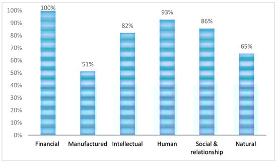 Focusing on the 84 IRs which provide information on at least two out of the six capitals, Figure 1 shows the percentage of IRs which give information regarding the six capitals, as illustrated in the IIRC Framework []. While all the investigated IRs illustrate the financial capital, only 51% and 65% provide information regarding manufactured capital and natural capital, respectively. However, it is worth noting that a high percentage of IRs illustrates intellectual capital (82%, which corresponds to 69 IRs out of 84), supporting the idea that IC (as defined by management literature) is experiencing a resurgence as a component of IR [].