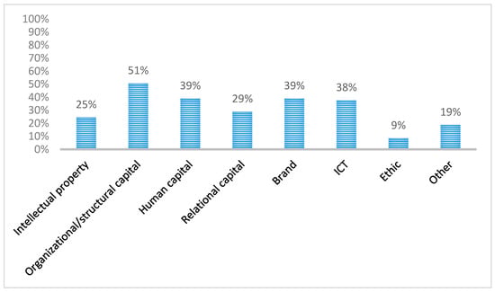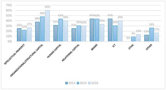 Furthermore, Figure 3 shows the IC components used in three different years. An increasing trend can be observed only for three components: namely organizational/structural capital, ethic capital and relational capital, even if this last capital shows the same percentage (30%) in the last two years. In most of the cases, there is a fluctuating trend such as for “intellectual property”, “human capital”, “ICT”, and “other”. Instead, and quite surprisingly, the component “brand” presents a decreasing trend.