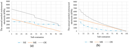 The annual amount of outsourced electricity for: (a) Scenario 1; (b) Scenario 2; and (c) Scenario 3.