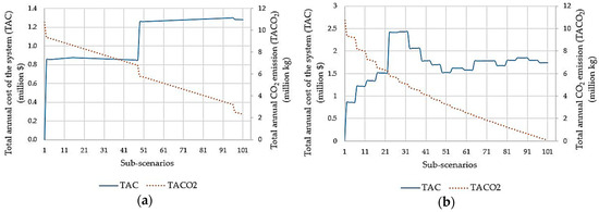 The TAC and TACO2 of the optimal system are compared in Figure 11 for three scenarios and considering all 101 sub-scenarios. The TACO2 decreased for all three scenarios as the contribution of the RES increased. On the other hand, the TAC depended on the sub-scenarios; the RES contribution increased as demand load increased. Accordingly, the size of PVs and WTs increased, but the size of battery fluctuated depending on the demand load patterns. A robust configuration should, therefore, be determined by analyzing combined CEECs. For this purpose, a graphical approach was followed.