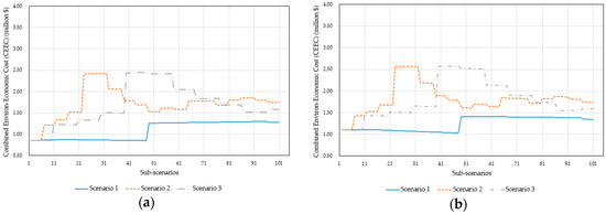 A CEEC was obtained for all management scenarios and sub-scenarios, and the results are presented in the Supplementary Materials. The results are also shown graphically in Figure 12, excluding those for sub-Scenario 1, in which no contribution was made to the HRES. Scenarios 1–3 are depicted in continuous blue, dashed orange, and gray lines in Figure 12, respectively. As in Management Case 1, the CEEC was equal to TAC in Figure 12a. The smallest TAC was obtained in Scenario 1. The TAC slightly decreased in Scenario 1 until an abrupt jump occurred after sub-scenario 47, in which the CEEC was equal to $850,710/year. The optimal configuration was determined when the HRES met 47% of the MBR demand load, considering only the economic model. Solar and wind power shares were 90%, and 10%, respectively, in the optimal HRES. This configuration is recommended for regions where the air quality is good and economic growth has a priority. The BC, NE, and number of PVs and WTs were 3773 kWh, 2818 MWh, 316, and 1, respectively, in the optimal configuration of Management Case 1.