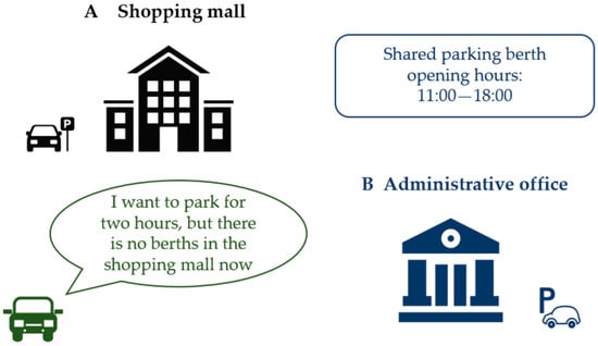 Taking the parking facilities of the shopping mall and nearby administrative office as an example, the floating charge method proposed above is used to adjust the shared space price. The shared scenario hypothesis was that when a person drives to a shopping mall during the day, the parking facilities of the shopping mall are close to saturation, and there is a parking facility of an administrative office unit that is open to the public for sharing in the day.
