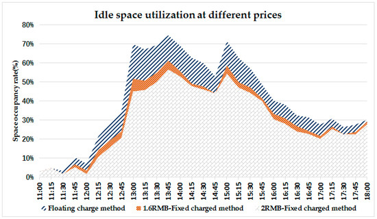 In terms of idle space utilization, the utilization rate of idle spaces in the whole shared space–time window was 40% in the case of the floating charge, while the utilization rate of fixed charges of 1.6 RMB/15 min was 32%, and that of fixed charges of 2 RMB/15 min was 30%. During the peak period, the average utilization rate of idle spaces under the latter two charging methods was 49% and 46%, respectively, while the average utilization rate of floating charges was 62% and the peak value was 71%. By means of floating charge adjustment, more than 60% of the idle spaces in the administrative office parking lot were effectively utilized during the peak sharing period. which can provide a better way to explore the space resource potential of the shared parking lot.