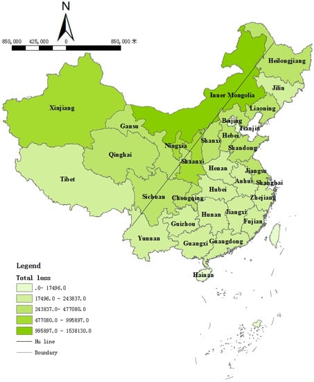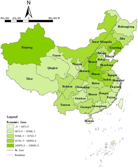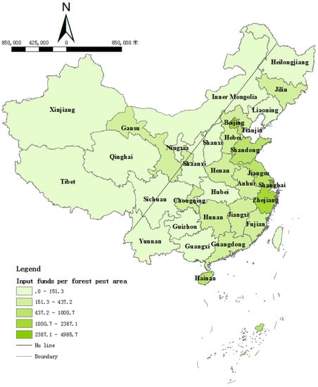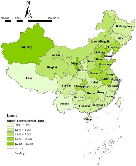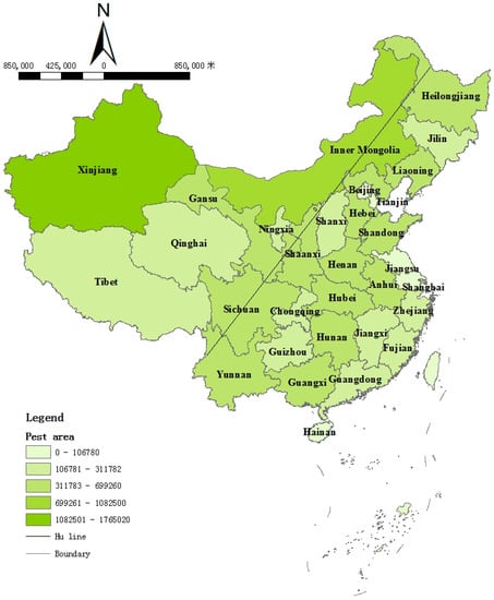 Forest pests are considered the most expensive species in the world, causing gross yield losses of up to at least 10% to 16% before harvest, and are responsible for the destruction of more than 350 million ha of global forestland []. Indeed, invasive pests alone are associated with a cost of more than USD 7 billion []. They not only destroy forests and infrastructure, but also spread diseases among humans and animals. It has been estimated that the USA and Brazil lose more than USD 14 and 17.7 billion each, annually [,]. China is projected to face similarly alarming consequences, wherein it might sustain ecological and economic losses of approximately USD 16.94 billion, which exceeds 10% of the total annual national forestry output []. However, the other major issue facing the Chinese government is the existence of serious spatial differences among provinces in both, pest-induced losses and pest-control measures. These striking contrasts attracted our research interest with respect to how the distribution on either side of the Hu Huanyong Line is regulated and the reasons for the observed differences among provinces.