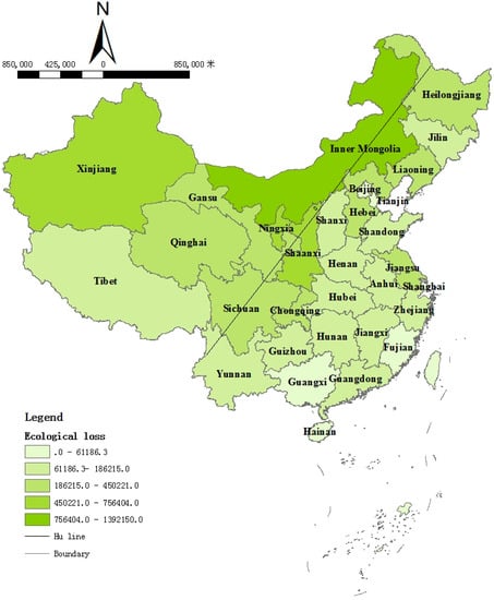 We present the final results of our calculation using each model with relative variables on the Chinese map using the ArcGIS software in Figure 1, Figure 2, Figure 3, Figure 4, Figure 5, Figure 6, Figure 7 and Figure 8. As for the details, Figure 1 shows the forest pest outbreak situation of each province. Nearly the entirety of China is affected by pests, although the problem in the northwest region is more serious than in the southeast, especially in Xinjiang and Inner Mongolia. Figure 2 shows that, with regard to forest pest-control rate, Xinjiang was the most damaged province in the northwest, while the provinces around Bohai sea coastal areas were also seriously affected, especially for Shandong. Figure 3, Figure 4 and Figure 5 show the economic, ecological, and total loss, respectively, mostly in agreement with pest-outbreak area and the rate distribution rule; economic loss in the southeast was more serious than ecological loss, while total loss was highest in the southeast, especially in Xinjiang and Inner Mongolia.