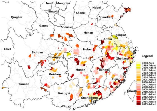 Bursaphelenchus xylophilus expansion pattern from 1998 to 2015 (Unit: county). This source has already been published by State Forestry Administration of China (SFA)and SFPCA [,].