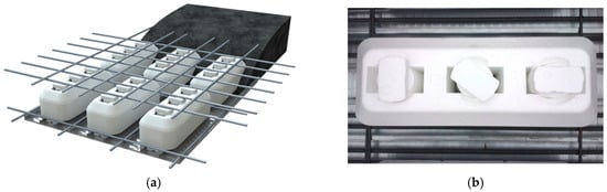 Moreover, previous studies [,,,] showed that the void formers should be firmly installed and fixed to the lower reinforcement by using anchoring devices. These additional materials would increase the amount of construction materials. However, the anchoring materials adopted in this study were designed to be integrated with the void formers, and accordingly, both were manufactured by using the same materials. In addition, the anchoring mechanism involved inserting the fixers in the holes penetrating the void formers, and turning them by 90°. In this manner, they would be installed between the ribs of the deck plates (see Figure 2). Thus, the anchoring method for the void formers in this study would significantly lower the quantity of the reinforcing bars and the steel materials.