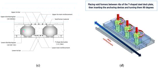 This research proposes a Void Deck Slab (VDS) system, a newly developed void slab system that eliminates additionally introduced steel materials for the prevention of buoyancy, and incorporates a newly developed device for anchoring the void formers to the reinforcement. As shown in Figure 2, the VDS is so devised as to avoid the use of steel materials for anchoring the void formers, thereby improving the precision of installation. Moreover, the VDS helps to simplify the construction procedures, so as to shorten the construction time and to secure economic efficiency. Figure 2 depicts the cross-sectional and schematic views of a VDS that is composed of T-shaped steel deck plates, lightweight void formers made of expanded polystyrene (EPS), and anchoring devices. It is evident from the cross-sectional view that the lightweight void formers are placed between the ribs of the T-shaped steel deck plates. The materials used for anchoring the void formers to the deck plates are also made of EPS, instead of steel. Moreover, the method of installation is so simple that the anchoring devices are just inserted into the slots, and fixed firmly by a 90° rotation, and even a novice worker can install and fix the void formers with a high degree of precision and improved workability (see Figure 2d).