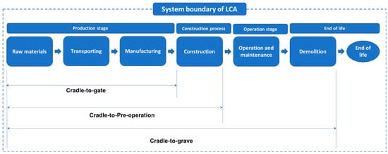 In the evaluation of CO2 emissions, it is necessary to establish a system boundary for the life cycle assessment of the studied model. The system boundary envisaged in this study was from raw material to the pre-operation stage of the reinforced concrete slab and void slab systems (Figure 3) based on ISO 14044 [] and ISO 21930 []. The production of both slab systems consisted of the stages: raw material, transportation, and manufacturing. Equation (1) was used for the calculation of the CO2 emissions of each material of the two slab systems.
