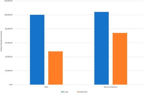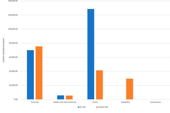 The total CO2 emissions of the ordinary reinforced concrete slab and the void slab systems were 204,433.06 and 151,754.75 kg CO2-eq, respectively. The void slab system emitted ~34% less CO2 than the ordinary reinforced concrete slab system. In the case of the ordinary reinforced concrete slab system, moulds accounted for ~62% of CO2 emissions, followed by concrete (~34%).