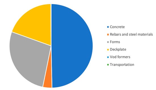 The CO2 emissions of the void slab system were also computed, and the total emissions were observed to be 151,754.75 kg CO2-eq. The greatest source of CO2 for the void slab system was ready-mixed concrete, which accounted for ~49.7% (see Figure 6). Moulds followed the ready-mixed concrete; the CO2 emissions were 75,381.60 kg CO2-eq, accounting for ~27.2% of the total emissions. The use of deck plates constituted ~19.4%, as shown in Figure 7. The emitted CO2 from transportation was less than 1%, similar to the ordinary slab data.