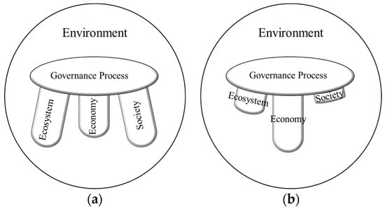 Theoretical model (a) a Canadian sustainability stool [54] and (b) the layout of a Canadian sustainability stool according to empirical study.