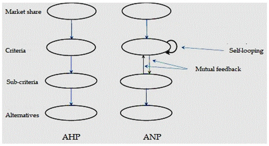 Schematic representation of the Analytic Hierarchy Process (AHP) and the Analytic Network Process (ANP) for the market share model. Source: Authors’ own representation based on [2].