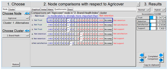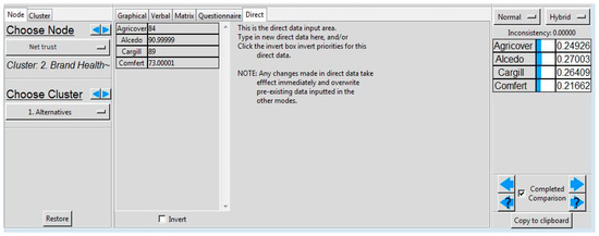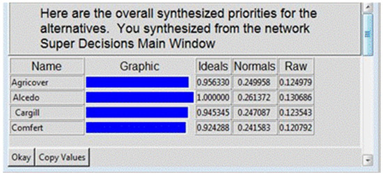 The interface of the Super Decisions software allows us to make comparisons in two ways: directly or through the questionnaire. The scores obtained for each company during the study were introduced in the direct mode—this mode of questionnaire is used if the judgments are made from a qualitative point of view and expressed numerically by a fundamental scale (see below). A detailed discussion of the optimal choice of numerical scale can be found in references [45,46,47].
