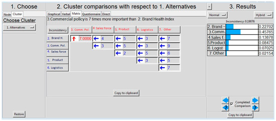 Next, the quantitative study was aimed at determining the relative positioning of the companies in the industry, according to the farmers’ perception of a number of performance indicators. Each feature identified in the qualitative research phase was framed together with related subcategories. A quantitative study was then conducted, using a questionnaire administered during a 60 min face-to-face interview with each farmer. The surveyed population was represented by Romanian agricultural enterprises that work with more than 100 hectares of crop (wheat, corn, etc.) to make sure that these farmers continued to set up the technological sheet of a culture. The sample consisted of 505 farmers, among which 300 were a national representative sample, and 205 were a boost sample. The sampling method employed was non-probabilistic purposive sampling in which the members were selected in accordance with the purpose of our study. The results were used to develop the ANP market share model and perform pairwise comparisons to competitors with respect to each node. Dedicated software (Super Decisions) was used. Within this model, the relevant alternatives are represented by the main distributors of agricultural inputs, and the main criteria according to which they are judged are the following: Brand health index, Commercial policy, Sales force, Products, Logistics, and Servicing. The estimation of the market share is structured as a network of nodes and clusters. The decision alternatives in the model are the competing companies, and the results are coefficients that describe the relative dominance of the alternatives. The results obtained with the Super Decisions software were validated with the actual market share measured by the annual industry study conducted by Kleffmann Group Romania.