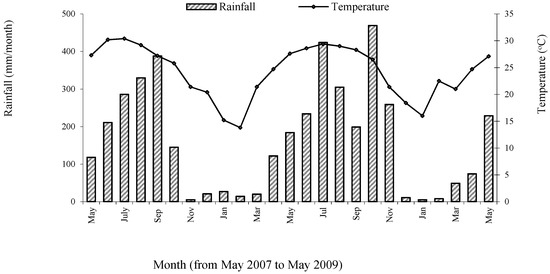 Monthly total rainfall and mean monthly temperature from May, 2007 to May, 2009 in Hanoi (Lang Ha Meteo Station).