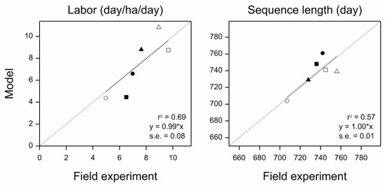 There was reasonable agreement between the model data for crop systems labor requirements and the data obtained in the field experiment (Figure 2). The same applied to the length of the crop sequences. The model data on profit and cost of pesticide use of crop systems correlated poorly with those from the field experiment (r2 could not be calculated because SSy < SSe and r2 = 0.20, respectively).