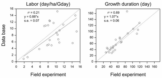 Correlation between data on crop labor requirement from the database and from the field experiment was not particularly strong, but data on crop growth duration correlated quite well, except for one outlier (Figure 3). The outlier concerned tossa jute, for reasons explained above.