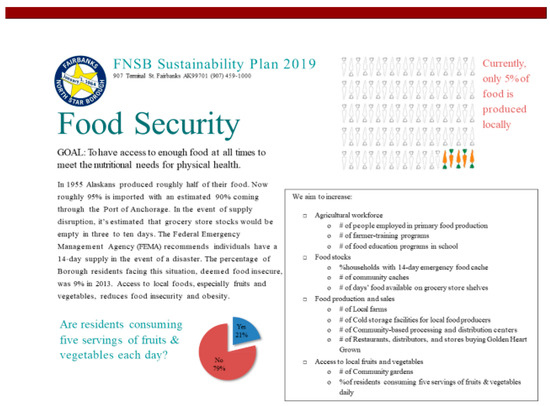 http://fnsb.us/Boards/Pages/SustainabilityCommission.aspx (accessed on 5 April 2019)). Residents of Fairbanks believed that the main problem they faced in the realm of food was that they imported nearly all of their food from beyond state boundaries. Local citizens worried that if supply lines were cut as the result of an extraordinary hazard, they would face severe shortages because there was a widely-held belief that Fairbanks only had a 3-day supply of food on hand.