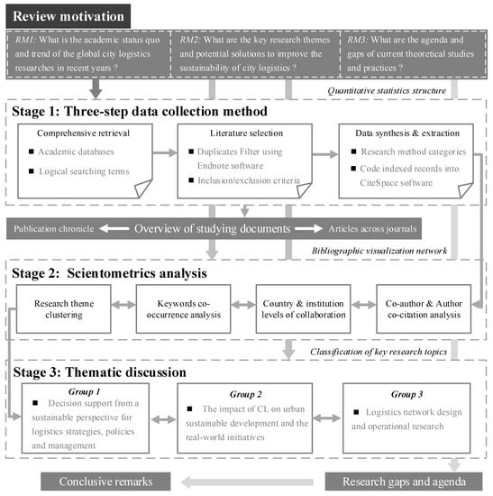 Many review-based studies have been conducted to integrate the efforts and experience of CL development. Lagorio et al. [10] investigated the general publication resource, bibliometric citation network and main topics from 104 studies during 2000–2015. Dolati Neghabadi et al. [11] systematically reviewed 370 CL literature items published from 2010 to 2016 and summarized research topics based on keyword classification method. Allen et al. [12] reviewed 162 studies over the last 50 years and identified 12 different survey techniques that associated with the data collection issues in urban freight deliveries. A review oriented to 150 proceedings of the International Conference on City Logistics from 2009 to 2013 was provided by Behrends [4], in which the author indicated that more research was necessary to address the urban logistics in developing regions. Lindholm [13] critically reviewed 346 relevant literatures and proposed an improved framework for the measurement, monitoring, and performance indicators of urban freight transport from the perspective of the government. Existing reviews have made a significant contribution to outlining the CL research history and expanding the future horizon [9,14]; however, efforts to use objective and quantitative methods to map out the visualized relationships among the researcher clusters, collaborative institutions and high-frequency keywords in this field are limited.