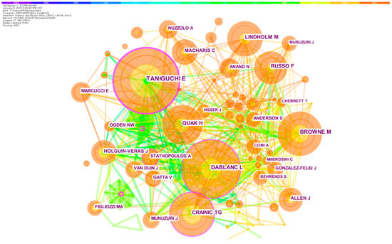 According to graph theory, Freeman’s betweenness centrality [30] is an effective indicator to evaluate the importance of nodes in the network, and it has been widely applied in the previous scientometrics review [18,19]. The betweenness centrality can be calculated via formula Equation (1), where μmk is the sum of shortest paths from node m to node k; and μmk(i) is the number of those paths that pass through node i. The node centrality score can be detected by the color of the rim in CiteSpace [18]. Nodes with purple rim have higher scores, indicating important relationships among large clusters they link. In Figure 4, the authors with purple rim include Michael Browne (centrality = 0.14), Hans Quak (centrality = 0.08), Christian Ambrosini (centrality = 0.03) and Laetitia Dablanc (0.02). These nodes show frequent collaboration with authors from different clusters.