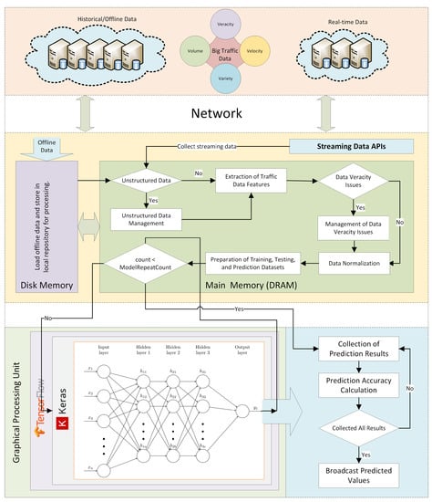 In this work, as shown in Figure 2, we collect the data stored on cloud database servers. It could either be a historical data saved on clouds or streaming real-time data. Off-line or historical data could be downloaded to the disk storage for further processing but the streaming data could be accessed directly by using the provided streaming data APIs and stored in the main memory by using different in-memory computing tools and technologies such as R [48] and Spark [49]. Currently we are working on the historical data provided by TFL authority under the RODS program (See Section 3.2). This historical data could be downloaded directly to the storage devices as shown in the figure. If we are downloading the historical data, then we can say that we are not dealing with one of big data’s v i.e., velocity, but we must deal with others such as volume, variety, and veracity. We must deal with these Vs to convert it into the required format so that it could be used as an input to our deep learning model. Before starting processing, our framework proposes to load this data to the main memory by using the in-memory management tools. Sometimes, datasets are found in the unstructured format, so in that case, first these are converted into the structured format. Then the data undergoes through a data processing phase where it is parsed so that it could be brought into the format as per the requirements of the deep learning model. This is the phase where we deal with the big data veracity issues as well.