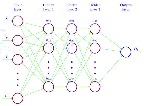 We are using deep NNs for prediction purpose in this work. In a NN, many neurons are used in such a way that the output of a neuron could be used as an input to the other neurons in the network as shown in Figure 5. Here the left most layer is the input layer with 14 input parameters and the right most layer is the output layer which has one output parameter. There are three hidden layers in this model where number of hidden units in each hidden layer is a, b, and c respectively. In our model we have used , , and . Number of neurons in input layer and hidden layers could be different from one deep model to other and the number of hidden layers could also be different from one model to other.