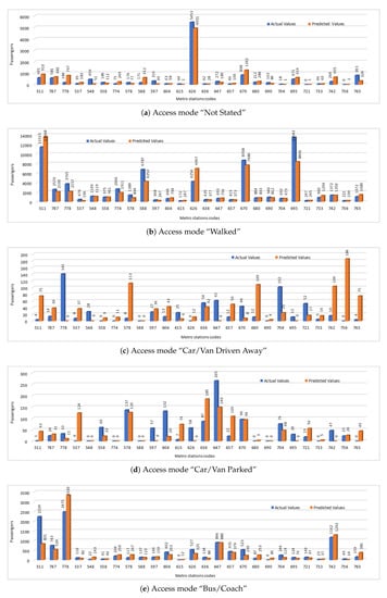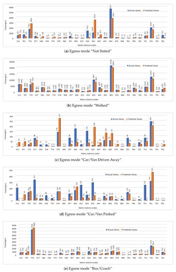 We have compared the original number of passengers exiting the metro stations using selected egress modes with the passengers count predicted by our deep model. Same as we did in access modes, we have 10 different egress modes, but for the comparison of original and predicted values, we have selected five egress modes. The reason to compare the values with only selected egress modes is that some of the modes does not have a reasonable amount of data that could be used to make a meaningful comparison. In Figure 9, we have shown the actual and predicted number of passengers leaving the stations using different egress modes. In these figures, we have used the station codes and number of passengers exiting at different times to predict the number of passengers exiting at “p.m. peak” time interval using different egress modes. To find the station names corresponding to the station codes used in this figure, please see Table 4. If we compare the prediction results, we can say that in some cases, predicted values were very close to the actual values. For example, if we compare the results for egress mode “Walked” Figure 9b, we can see that accuracy is very high in this egress mode. This egress mode also has highest number of passengers reported among other results shown in this figure. Also the predicted number of passengers are very close to the actual number of passengers in case of egress modes “Bus/Coach” Figure 9e. However, if we see the results of “Car/Van Driven Away” or “Car/Van Parked” modes Figure 9c,d we can say that the predicted values are bit different than the actual values and unfortunately the predicted values are not as good as these were in above two cases. One reason of this low accuracy in these two modes could be the high variation in the passenger data. Also, number of passengers in these two cases are very low as compared to the other modes discussed above.