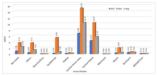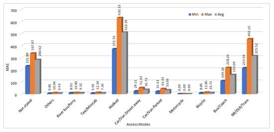 The prediction accuracy shows high variation due to the nature of the dataset. This is clear from the results and by showing minimum, maximum, and average error values for all the access modes. In some cases, there was no change in data across different stations, so the prediction accuracy is very high for those access modes. As shown in Figure 7 and Figure 8, both mean absolute error and mean absolute percentage error values are zero when motorcycle is used as an access mode. This is because the data patterns on all the stations for the number of passengers traveling through motorcycles were same. Therefore, the predicted values for number of passengers using motorcycles to reach the stations were also accurate. In some cases, absolute mean error value was high as compared to other access modes as we can see from Figure 7. We can see that error value for the access mode “walked” is higher than all the other access modes which shows that the predicted values were much different from the actual values. However, if we see the Figure 8, mean absolute percentage error values are very low for those passengers who mentioned the station access mode as “walked”. This is because of a lot of variation in data of passengers who entered the station by walking. In some stations, such passengers were in hundreds, on some stations they were in thousands, and on some stations those were in tens of thousands. Therefore, the MAE is very high because the predicted values are different from the actual values, but the MAPE is comparatively very low that shows that it is tolerable. Same is the case for the access modes “Car/Van driven away” and “Car/Van parked”. In some other cases, such as “Taxi/Minicab”, “River bus/ferry”, “Others”, and "Bicycle”, the error value calculated using MAE was low and it was not very high when using MAPE method as well.