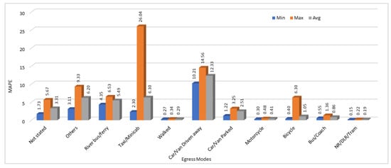 Minimum, Maximum, and Average MAPE Values: Prediction of Egress Modes (Section 4.2).