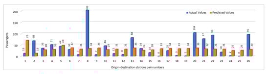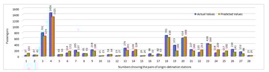 We have predicted the number of passengers traveling between the selected OD stations during the six different time intervals in a day. For this purpose, the deep model was executed with the same configurations set with a batch size of 5 and number of epochs were 1000. In this model, the input data was first changed by considering only the unique origin. The station codes (NLC) for OD stations, and the distance between the OD stations were also used as input parameters while predicting the number of passengers during weekdays. Figure 14 compares the number of passengers traveling between different stations during “weekday”. In this figure, vertical axis shows the number of passengers traveling between the origin and destination stations. Horizontal axis shows the OD pair number as we have not given the names of stations to make it clear on graph. To see the corresponding origin-destination station names against an OD-pair number, please refer to Table 8. In this table, we have given the distance between the ODs stations pairs used in this work to predict the number of passengers traveling between them on weekdays. Comparison of actual and predicted values shows that for small values, the predicted values were close to the actual values but for high data values, it was unable to predict accordingly and there was a big difference between the actual and the predicted values.