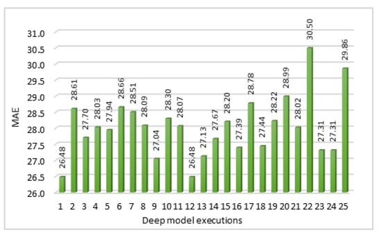 We have used the same DL model with the same model configurations as we have used before in the previous sections. Here the division of the dataset to be used as training, testing, and prediction has changed. In this case, dataset was divided into the ratio of 60, 30, and 10 percentage for training, testing and prediction, respectively. MAE and MAPE values have been calculated for analysis purpose in this case as well. Also, we are using ReLU as an activation function. The day time has been divided into six time intervals and we are using the number of passengers at five time intervals to predict the number of passengers at sixth time, so number of input features for our DL model is 5 and its output layer produces 1 feature to get a single estimated value. Due to the large amount of data, batch size is now 50 as compared to 5 which we have used previously in other models, but the number of epochs is same i.e., 1000 iterations per model. This model has also been executed 25 times to check the stability of our model and to see the variations.