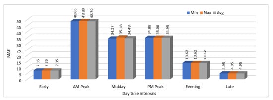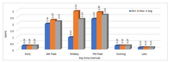 We have calculated both MAE and MAPE values in this case as well and again the model was executed for 25 time with the same configurations and input data to see the variations. MAE and MAPE values obtained by analyzing these results are shown in Figure 15 and Figure 16 respectively. Results show that during some time intervals, error rates were very high as shown for “AM Peak”, “Midday”, and “PM Peak” in Figure 15. Same trend is shown in the MAPE values graph in Figure 16. Another interesting thing about these results is that in all 25 executions of the same model with the same input data, prediction results were almost the same in all the executions because we can see that there are just minor differences in the minimum, maximum, and average MAE and MAPE values.