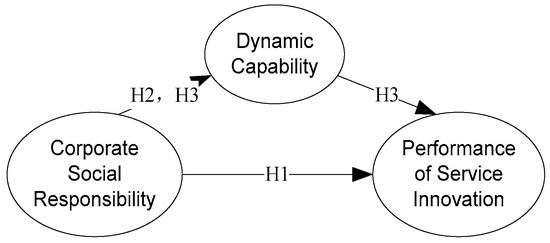 Dynamic capability may mediate the effects of CSR on service innovation performance. By definition, dynamic capability is the “the firm’s ability to integrate, build, and reconfigure internal and external competences to address rapidly changing environments” [24]. CSR not only improves the relationship of a firm with stakeholders, but also enriches the sources of knowledge, improves the flexibility of the firm in the reallocation of resources and capabilities, and helps generate fresh and valuable ideas for new service development. These positive changes within an organization in turn facilitate the transformation of organizational capabilities [25]. Kindström et al. [14] noted that dynamic capabilities enable the firms to identify service innovation needs. A strategic direction, such as CSR, may affect dynamic capability development, and the ensuing dynamic capabilities can in turn affect service innovation. Specifically, CSR may improve the performance of service innovation by improving the firm’s adaptive, absorptive, and innovative capability, i.e., the three dimensions of dynamic capability [11], and help the firm respond more effectively to a novel environment [26].