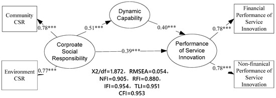 A separate model was estimated to test the indirect effects. The results are depicted in Figure 3. Hypothesis 2 predicted that CSR positively affects dynamic capability. The results show that the path index between CSR and dynamic capability is 0.51, significant at the 0.001 level, indicating that CSR positively influences dynamic capability. Thus, Hypothesis 2 is supported. Hypothesis 3 proposed that dynamic capability mediates the influence of CSR on the performance of service innovation. The results show that the path index between dynamic capability and the performance of service innovation is 0.40, significant at the 0.001 level, indicating that CSR also positively influences the performance of service innovation through dynamic capability. The estimated path for the direct influence of CSR on the performance of service innovation is still significant (β = 0.39, p < 0.01), indicating that dynamic capability partially mediates this path. Therefore, Hypothesis 3 is supported.