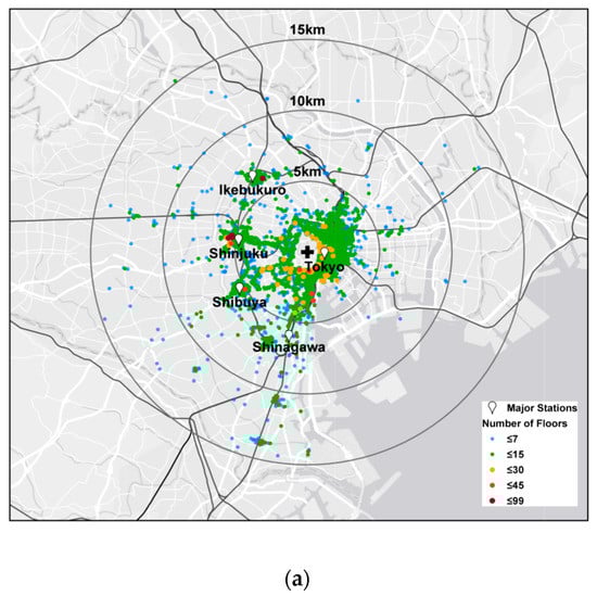 Among the world’s shrinking cities, Tokyo is unique in the sense that it is facing shrinkage while also being one of the largest gateway cities in the world. Many cities are showing common shrinking patterns [31], while global cities such as London, New York, and Tokyo have been growing continuously due to agglomeration effects. Therefore, they offer an opportunity to capture the shrinkage of their service-sector workplaces and their simultaneous rebirth. Unlike in the downturn and vacancy of central areas in shrinking cities in the United States and in Europe [32], Tokyo’s fringe is exhibiting vacancies while its central area grows.