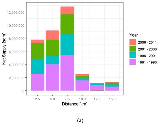Figure 4 shows the net supply by distance compared with the entire supply from 1991 to 2011 employing the TMG data. In panel (a), the horizontal axis is the distance from the CBD. The vertical axis is the degree of net supply (square meters). Thus, the bars show the increase in the total floor area within the distance interval from five years previously. The net supply includes (i) new development from (vacant) land and (ii) the redevelopment of existing buildings whose office floor area increases. Thus, panel (a) shows the growth of office volume over time. While the suburban office stock remaining in 2011 is supplied mainly during the bubble period (in this case, from 1991 to 1996), offices in the central area consist mainly of recent supply since 1996, which indicates that the obsolete office stock in the central area was rebuilt into larger offices after the bubble period.